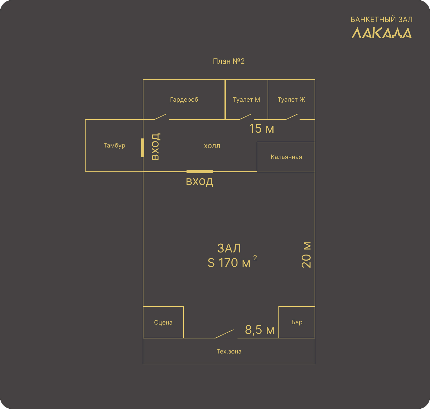 Малый зал идеально подходит для проведения камерных мероприятий до 80 гостей. Площадь зала составляет 170 м², что обеспечивает комфортное размещение всех участников мероприятия.